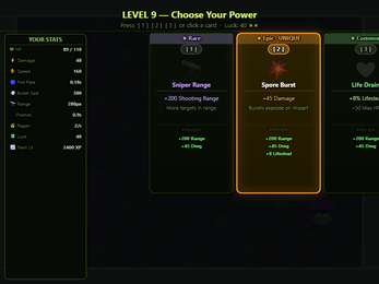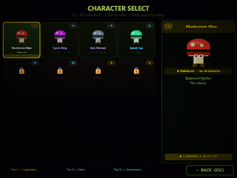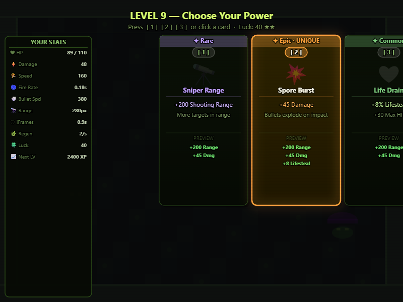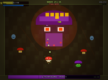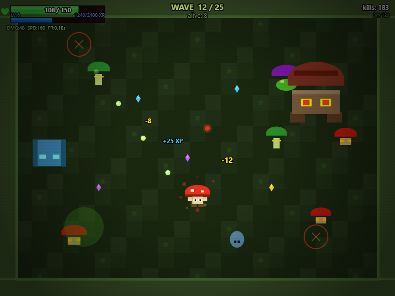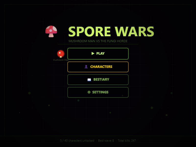 SPORE WARS is a top-down roguelite survival game. You are a mushroom man fighting endless waves of fungal horrors. Collect XP gems, level up, and pick upgrades to build your run. 30+ enemies, 40+ unlockable characters, and 4 difficulty modes including infinite waves.